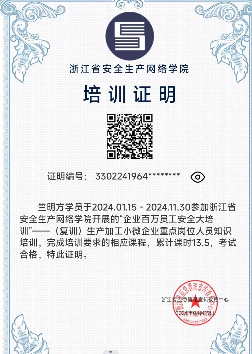 紧接着的4月12日又在公司组织开展了“企业百万员工安全大培训”,包括总经理在内的企业安管员、部门安全管理人员、重点岗位人员、特种作业人员等96人在“浙江省安全生产网络学院”手机APP上完成了规定安全内容课时学习并通过考试。网络课程内容涵盖“急救知识”、“《安全生产法》解读”、“临时用电作业安全知识”、“使用危化品单位人员作业要求”等内容,全面加强了公司相关人员安全意识,为企业安全生产零事故奠定了坚实的理论基础。